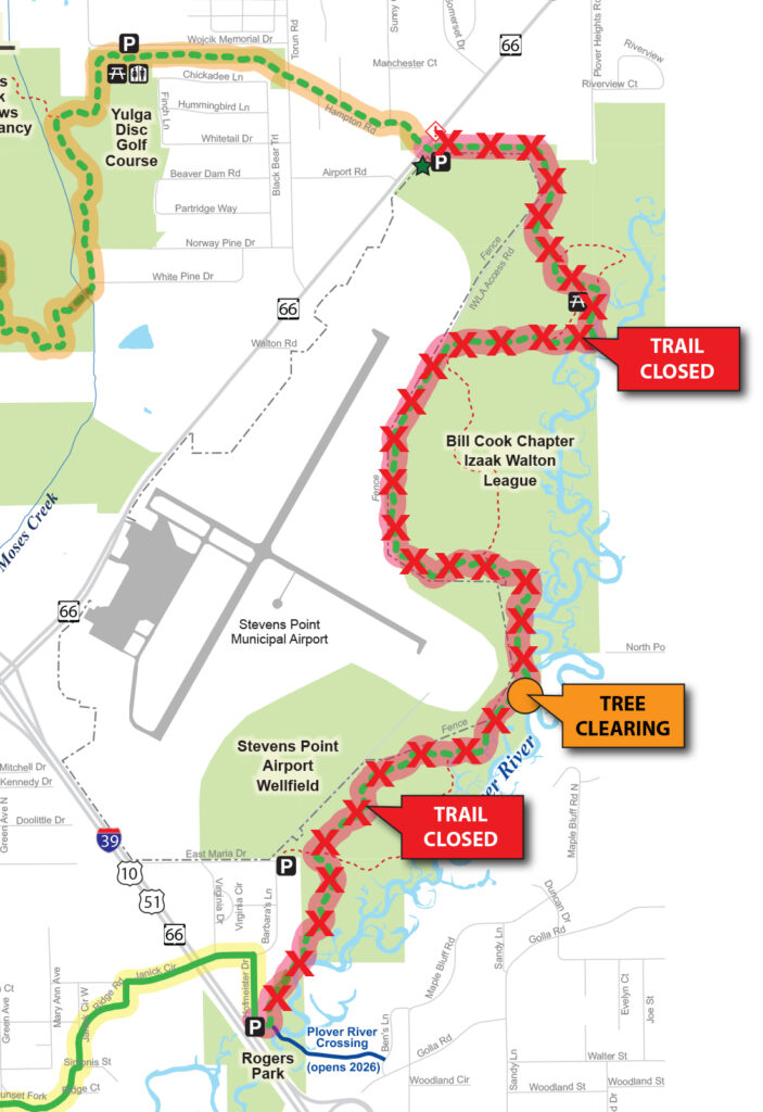UPDATE: The Plover River Trail and associated cross-country ski trails will now be CLOSED starting on FEBRUARY 25 for several days. The trails are being closed due to a tree clearing project adjacent to the Stevens Point Municipal Airport. Heavy machinery will be on and along the trail during this time. For your safety, please stay off of the trail system and out of the construction zone. See the map below for details.